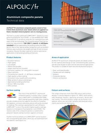 I pannelli compositi in alluminio ALPOLIC/fr sono composti da due fogli di alluminio di 0,5 mm di spessore che vengono applicati su un nucleo in polimero minerale ritardante di fiamma attraverso un processo di fusione. La superficie anteriore è solitamente rivestita con LUMIFLON™ – basato su una resina fluoropolimerica trasparente (FEVE) – oppure con DURAGLOSS® 5000. La produzione avviene utilizzando il processo di rivestimento in bobina con tecnologie all'avanguardia. I pannelli compositi soddisfano i requisiti di protezione contro gli incendi della norma